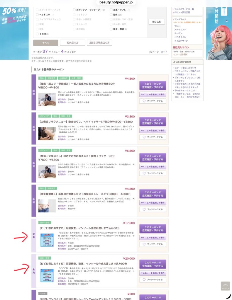 3.【ビビビ祭におすすめ】と書かれたクーポンを選びください。上から1番目と2番目にございます。検査とフィッティング、これに整体30分がセットになった2種類のクーポンがございます。
